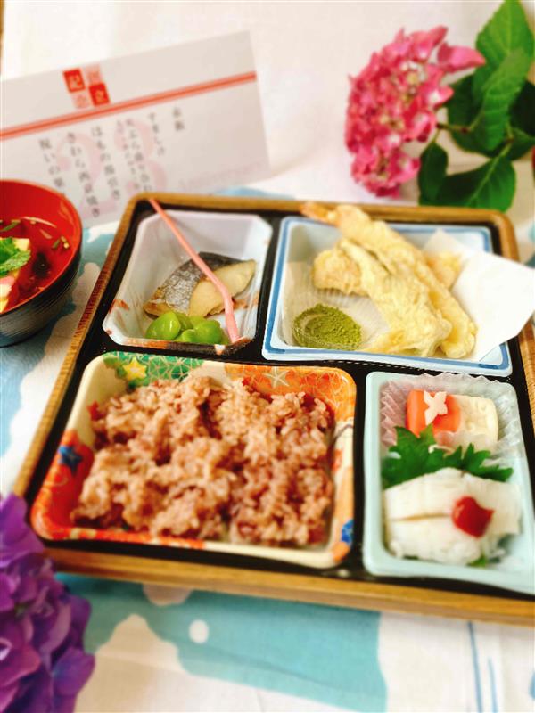 赤飯の鮮やかな色合いに始まり、旬の味覚を取り入れた天ぷらやはもの湯引き、香ばしく焼き上げたさわら西京焼きなど、華やかで心温まる献立となりました。最後には「祝いの菓」で締めくくり、創立記念にふさわしい一日を皆さまと分かち合うことができました。