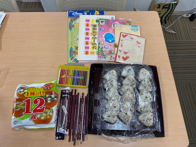 お届けの時間帯には、子どもたちが食事をしたり、絵を描いたり、本を読んだりと、それぞれ思い思いに過ごしており、おにぎりやお菓子、文房具などをとても喜んで受け取ってくださいました。